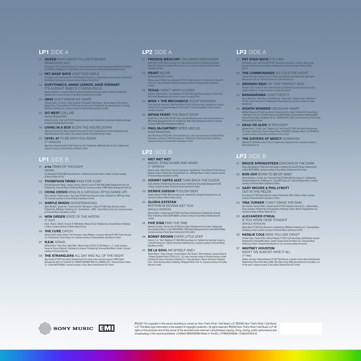 LP3 kicks off with a second appearance on this collection and with another #1 – Pet Shop Boys with the peerless ‘It’s A Sin’… Next up The Communards ‘So Cold The Night’ and Bronski Beat with ‘Hit That Perfect Beat’, leading in to the pure pop of ‘I Can’t Help It’ from Bananarama and ‘Cross My Heart’ from Eighth Wonder before Dead Or Alive with ‘In Too Deep’ – their third of four hits in 1985, and ‘Dominion’ from The Sisters Of Mercy closing the side in truly epic style…and over on the final side… Bruce Springsteen made one of the era’s defining albums with ‘Born In The USA’, and its’ lead single ‘Dancing In The Dark’ opens Disc 3, ahead of rock from Bon Jovi and the collaboration ‘Out In The Fields’ from Gary Moore & Phil Lynott. The collection closes with a run of soulful vocals from Tina Turner, Alexander O’Neal, Natalie Cole, and with a powerful performance from Whitney Houston on the sign-off ‘Didn’t We Almost Have It All’.