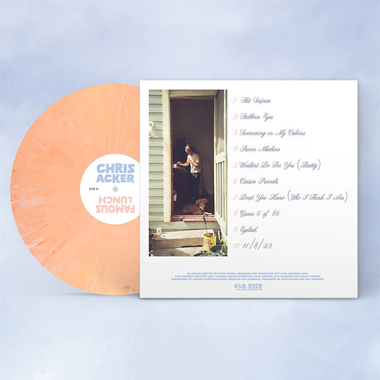 Chris Acker’s latest collection of songs, Famous Lunch, is in his words, a “growing pains album.” When writing the record, the New Orleans' based folk musician found himself hunting for a voice that wasn’t just an imitation of the one he’d been using on the last 30 songs he’d made. “At the same time, I worked hard to find a certain voice for myself over the previous 3 records and I didn’t want to abandon that.” While the album finds him continuing to transcribe life’s fleeting and provocative banalities with refreshing grace, the songs on Famous Lunch are intentionally more absurd, stylizing his lyricism as both poetic and disarming simultaneously— commencing with “Sh*t Surprise”—an earworm with a vernacular that stays true to its title. Inspired by George Saunders and Sasha Pearl (and wanting to make a song that sounds like Eagles saying the word “sh*t” over and over), “Sh*t Surprise” is the most Chris Acker song possible, in that its earnestness arrives in spades and comes varnished with a one-of-a-kind, spectacular gnarliness. “We’d match our breath in the upstairs room and we’d hold together ‘til I smelled like you,” Acker sings, before nose-diving into that unforgettable chorus about stepping in a smelly, disgusting pile of sh*t. More than anything else, Famous Lunch finds Chris Acker at his most sentimental and grateful, as he sings about Bunn coffee machines, gas pumps smelling like “the underside of a fingernail” in August, “10-inching” bread, stealing country club lawn-mower motors, father-son fables, impatient buffet lines, and a broom that “hasn’t been used since the last time I used it.” Acker’s eye for detail remains, and his lexicon includes phrasings that spin out like a hypnotic wash cycle. Seeing the world through his eyes, language remains something worth falling into—growing pains and all.
