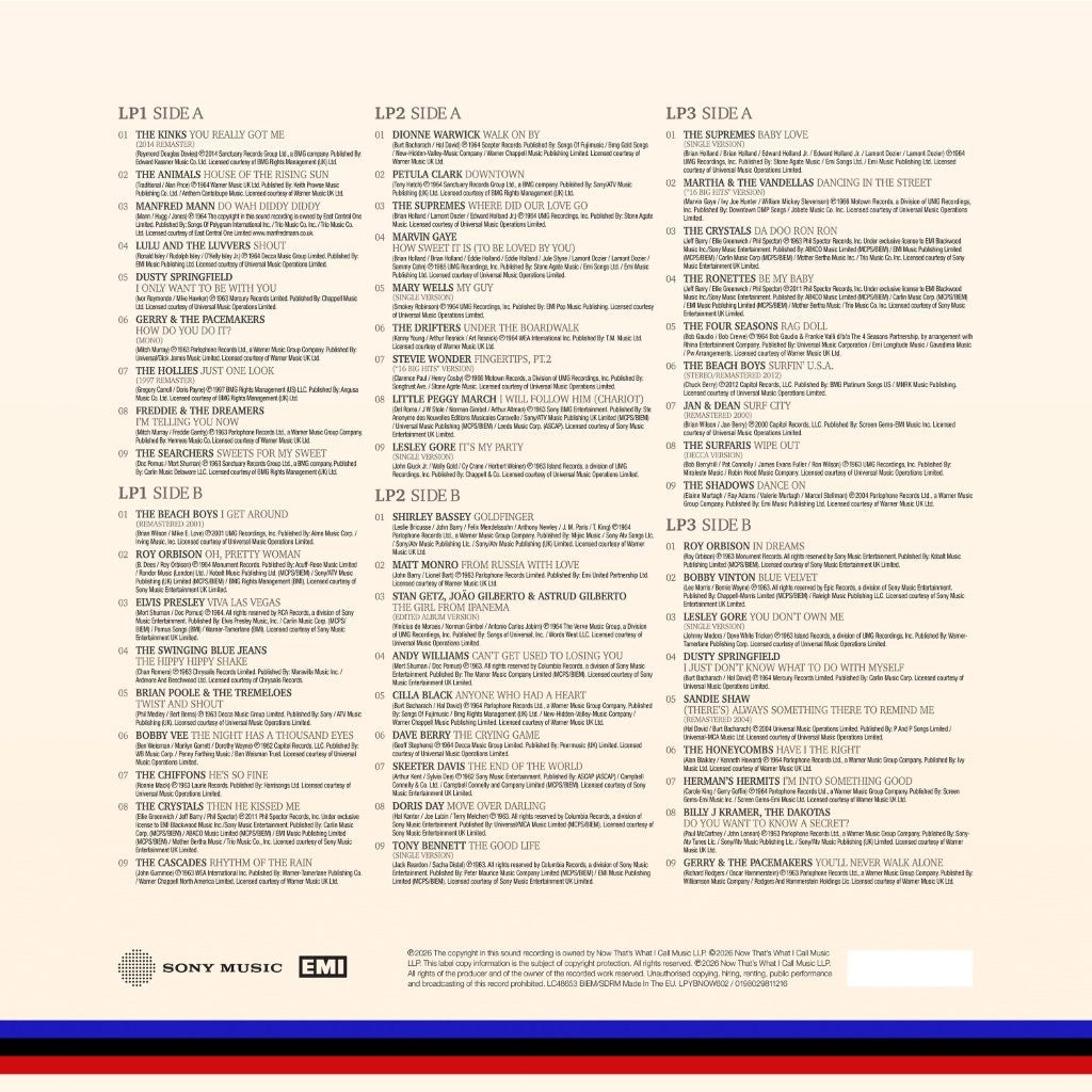 LP1 kicks off with The Kinks’ groundbreaking UK No.1 ‘You Really Got Me’, a track that helped define the British Invasion era, followed by equally unforgettable tracks ‘House Of The Rising Sun’ from The Animals, ‘Shout’ from Lulu And The Luvvers and Dusty Springfield with ‘I Only Want To Be With You’. The side is packed with instantly recognisable chart gold from Manfred Mann, The Hollies, Freddie & The Dreamers and The Searchers. Flip the LP over for The Beach Boys classic ‘I Get Around’, Roy Orbison’s signature smash ‘Oh, Pretty Woman’ and Elvis Presley’s ‘Viva Las Vegas’, with timeless pop gems from Brian Poole & The Tremeloes, Bobby Vee, The Chiffons, and completing the first LP, The Cascades with ‘Rhythm Of The Rain’.