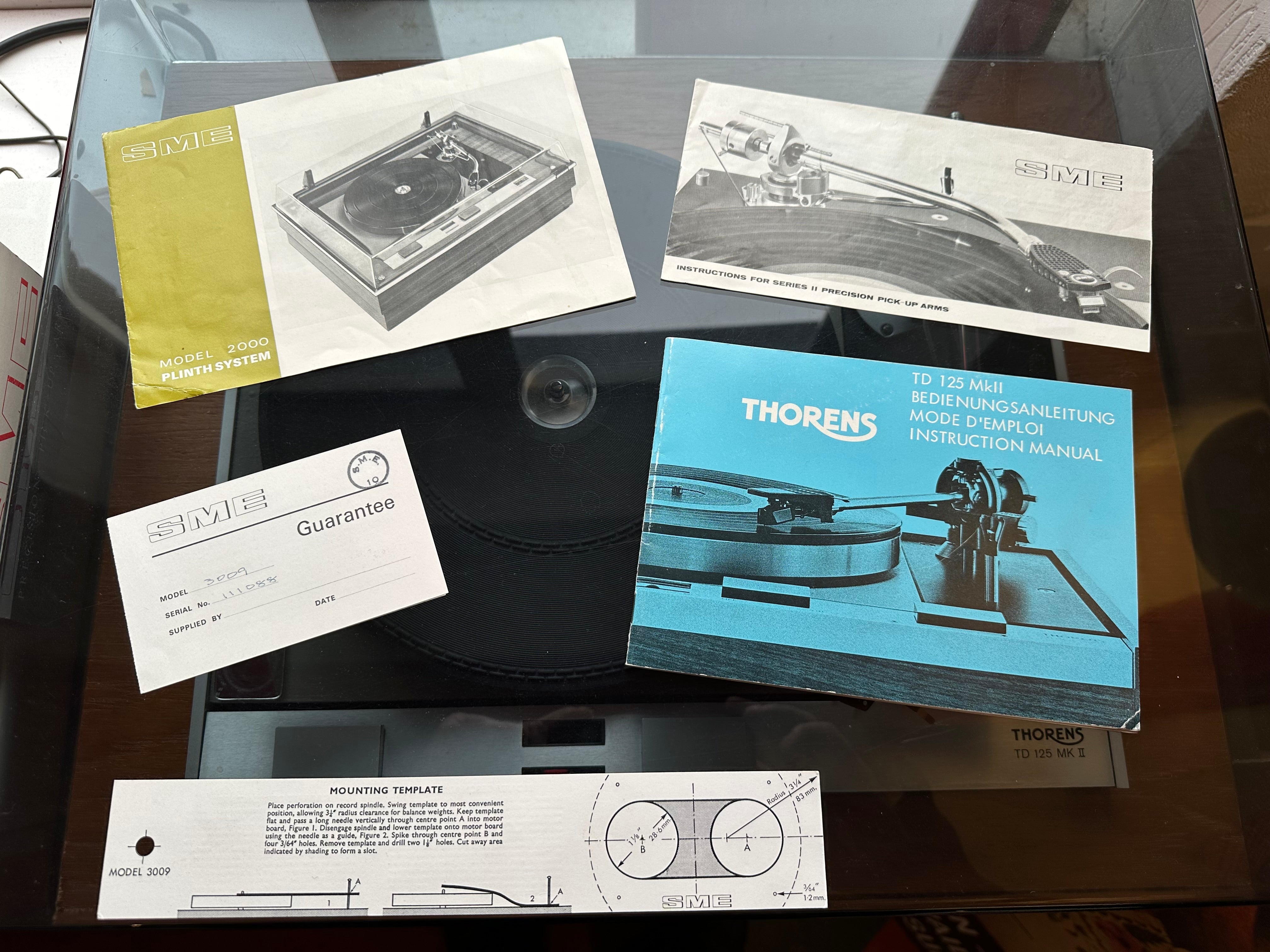 Classic vintage Thorens turntable with new Thorens belt SME arm. includes original box and booklets / guarantee card and original booklet for SME 2000 plinth. The Thorens TD 125 MKII