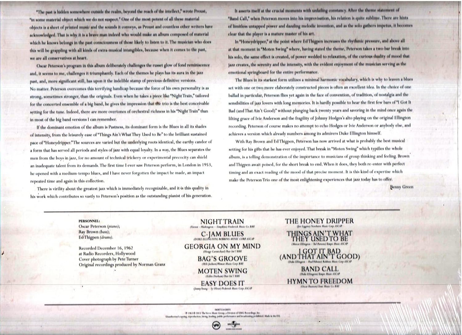 From the opening bars of the title track of this beautiful album, Oscar Peterson lays down the kind of piano playing for which he had been famous for well over a decade; the deftness of touch, the almost slight of hand, as he beguiles the listener into making it sound all too easy. Peterson talks through the piano and at his best he makes the piano sing. Just listen to 'Georgia On My Mind' who needs a vocal While Peterson has at times, unfairly, been called an unemotional pianist, that is not a criticism that can be leveled at Night Train. It is a beautifully recorded album that makes the piano, long-time Peterson trio bassist Ray Brown and drummer Ed Thigpen sound as though they are in the room. Despite having sold Verve to MGM two years earlier, Norman Granz produced this album as he was Oscar Peterson's manager; it is a fitting tribute to both performer and mentor.